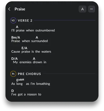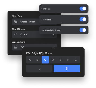 키를 변경하거나, 카포를 추가하거나, 코드 대신 숫자를 표시하여 코드 차트를 사용자 지정하세요. 다이나믹 큐를 숨기거나 표시하여 팀이 모든 곡의 트랙을 유지할 수 있도록 하세요.